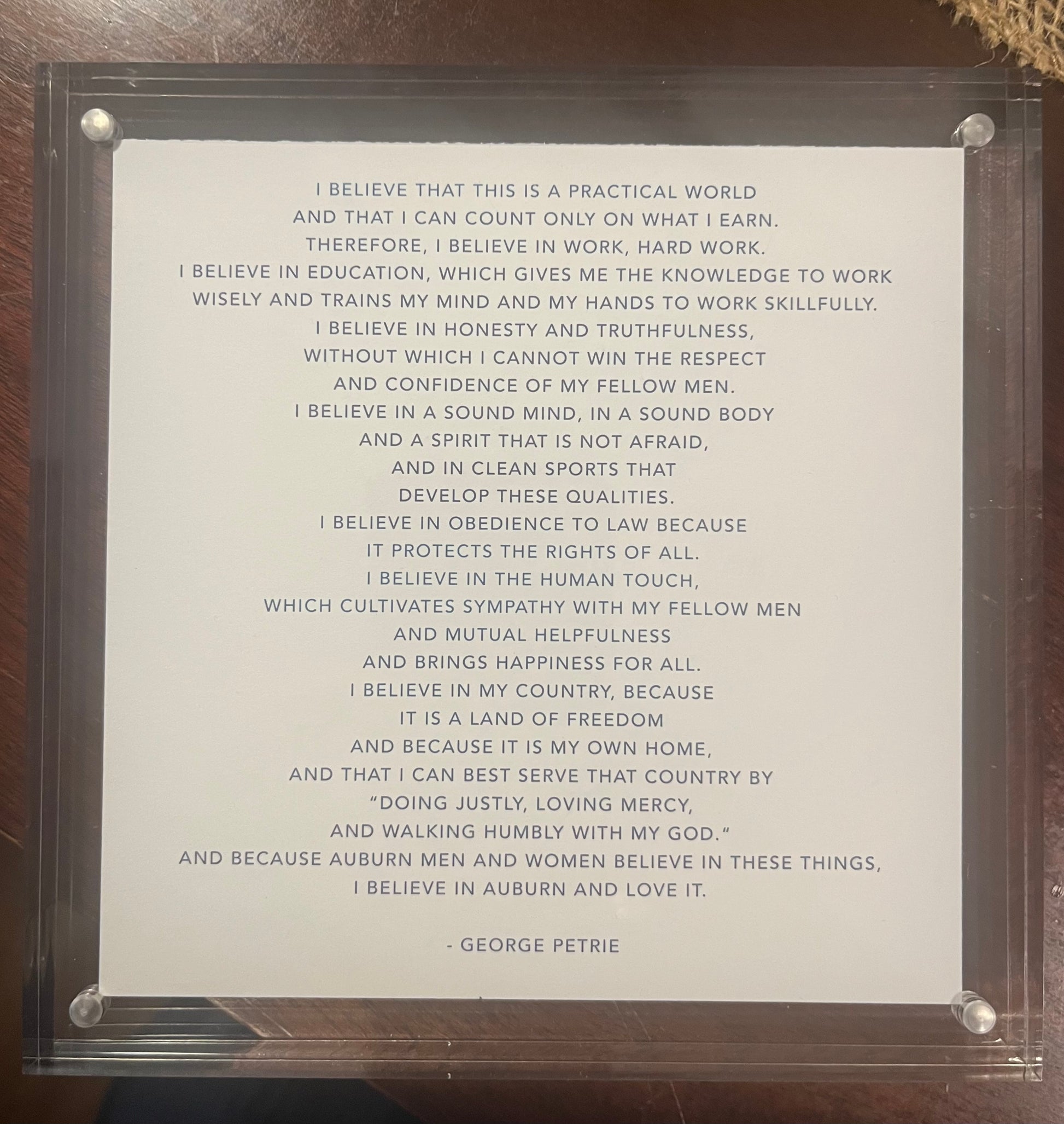 This Be the Creed product is on 5.25 x 5.25 paper with a watercolor of Samford painted by Memphis Artist, Dana Hay. It is framed in a 6 x 6 acrylic magnetic frame. The Auburn Creed is written on the back. Beautiful by itself or in a set with other framed parts of the creed.